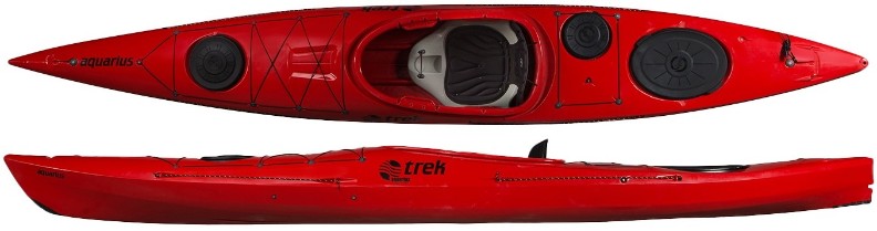 Aquarius Trek имеет удобные сидения и высокий кокпит, а также большие передние и задние места для хранения, что делает Trek хорошим выбором, как для долгих путешествий, так и для однодневных туров. Стандартная версия каяка Aquarius Trek имеет всё, что нужно для экипированного каяка : палубный настил, удобные сиденья, упоры для ног, передние и задние большие места для хранения, внутренние карманы, ручки для перемещения, сменные накладки на киль и мягкие подкладки по бокам в кокпите. Плюс данная версия поставляется с рулевым управлением.