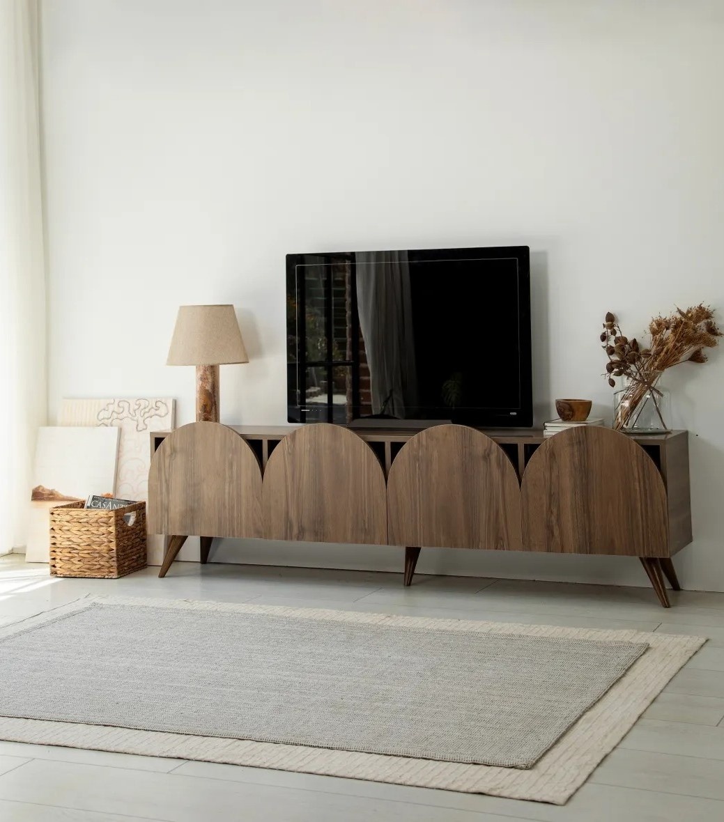 Современная форма придаёт тумбе выразительный и утончённый вид, благодаря чему она легко становится акцентом в комнате. Просторная верхняя поверхность подходит для телевизоров длиной до 180 см и обеспечивает комфортный просмотр.