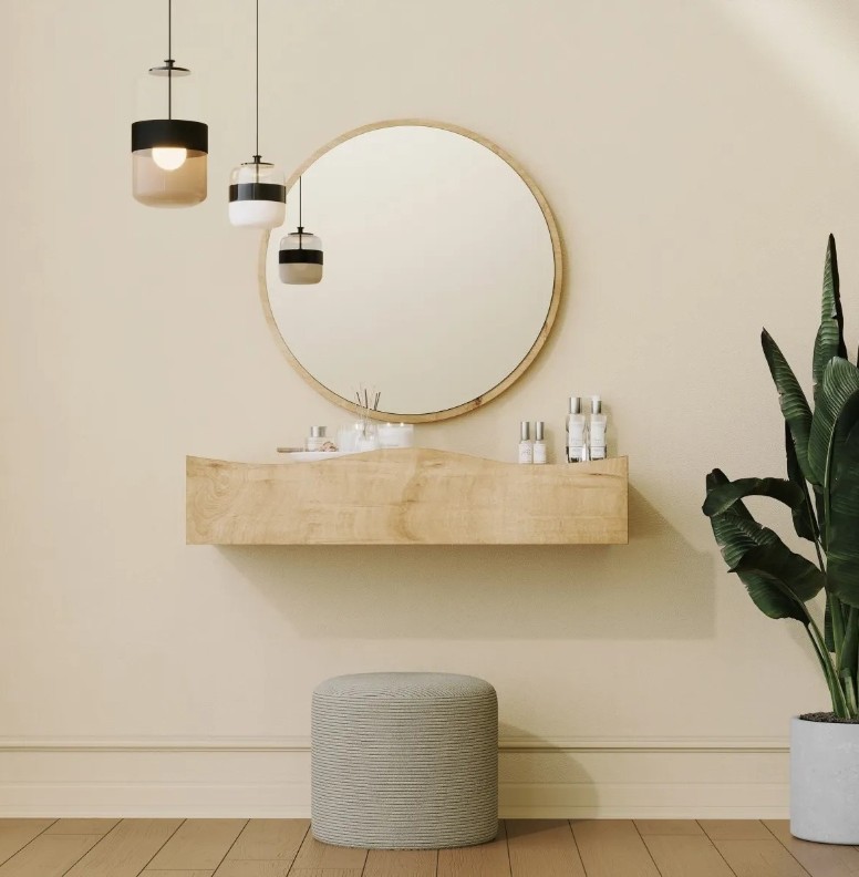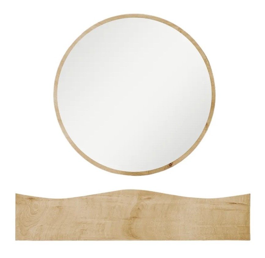 Главной деталью является зеркало диаметром 60 см. Оно добавляет шарм дизайну и служит функциональным элементом для ежедневного ухода, идеально дополняя комоду.