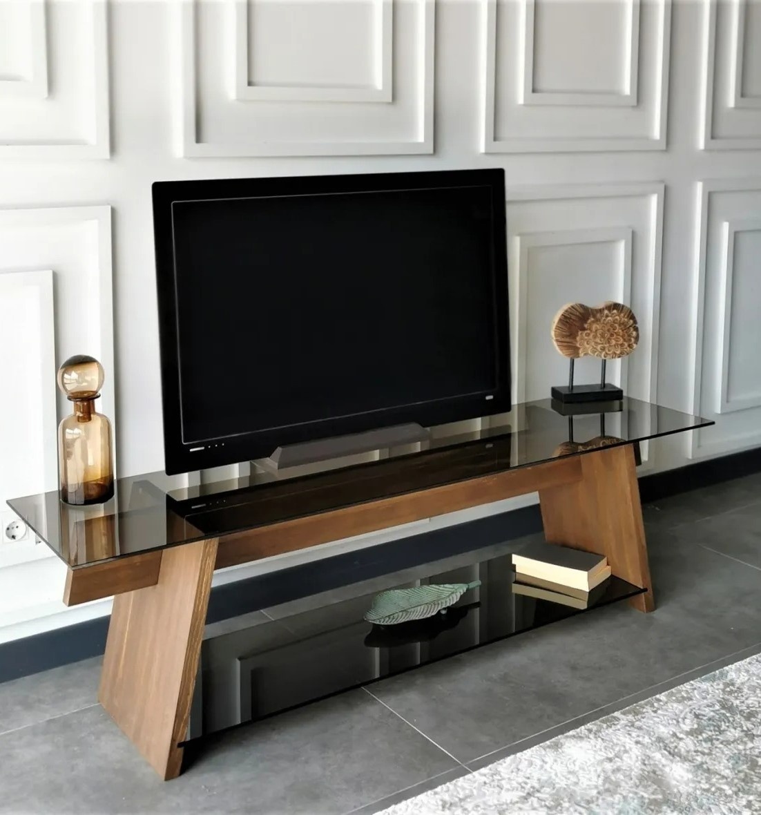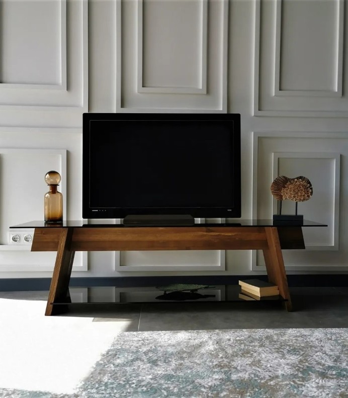 Конструкция из закалённого стекла толщиной 8 мм обеспечивает прочность и надёжность. Каркас из массива дерева создаёт эстетичное оформление и гарантирует долговечность тумбы, делая её долгосрочным решением для любой гостиной.