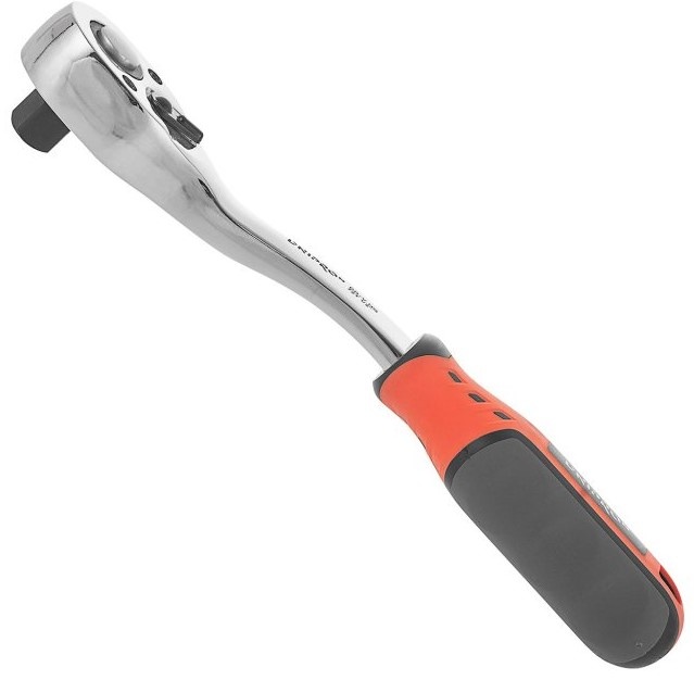 Рукоятка ключа разделена на три компонента, которые позволяют удерживать ключ-трещотку без риска выскальзывания. Прорезиненная основа делает использование ключа комфортным при разной температуре. Изогнутая форма позволяет работать в труднодоступных местах.