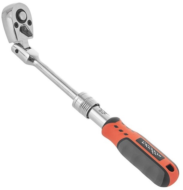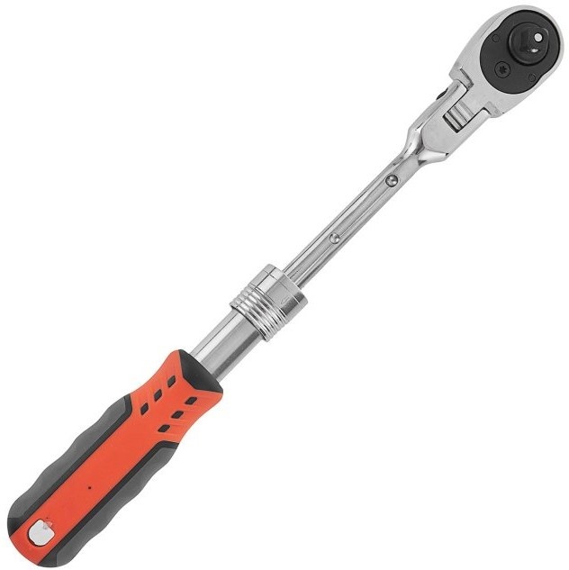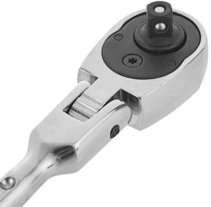 Инструмент оснащен шарниром, который позволяет фиксировать трещотку под углом в диапазоне от 0 до 180°. Вы сможете без проблем добраться даже до крепежей, расположенных в неудобных местах. У трещотки есть 72 зубца, минимальный ход составляет 5°.