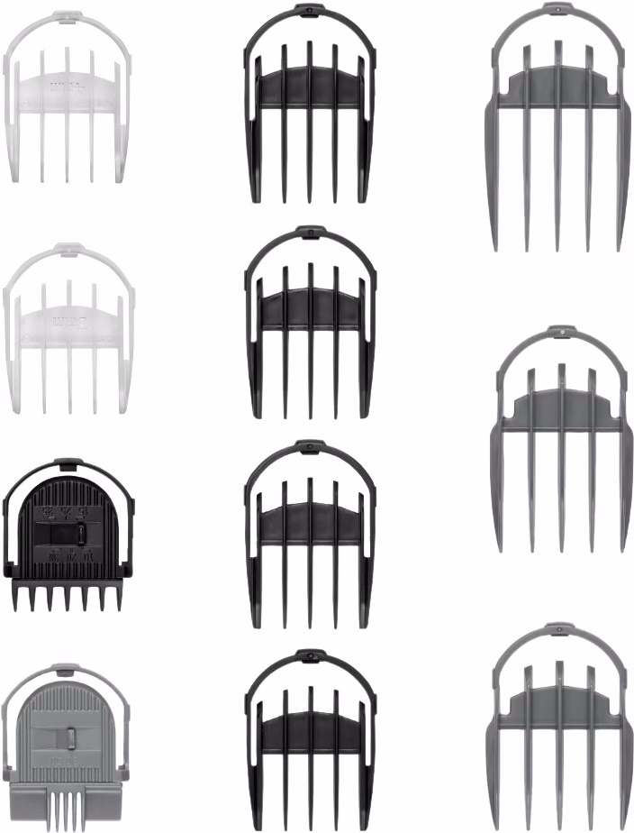 Комплектациящеточка для чистки, масло, насадка для бороды Precision Trimmer для отделки 0,2 мм, насадка для деталей Detail Foil Shaver, насадка для носа и ушей Nose and Ear Trimmer, магнитный насадка для волос Power Trimmer для отделки 0,2 мм, гребень-насадка с 6 положениями от 1 до 3,5 мм, 4 гребня для бороды 5 и 6 и 7 и 8 мм, 3 гребня для волос 9 и 12 и 16 мм, 2 гребня для тела 3 и 4 мм, гребень для бровей 3-5 мм