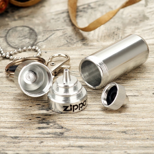 Миниатюрная алюминиевая канистра для бензина объемом 10 мл с кольцом для ключей. Бензина маленькой канистры хватит на полную заправку одной зажигалки. Герметичная крышка со специальным носиком позволяет легко, не проливая топливо заправлять зажигалку, а при хранении не выветривается. Полукруглая металлическая пластинка используется в качестве отвертки при замене кремня в зажигалке. Канистра также имеет резиновый рукав для хранения запасных кремней.