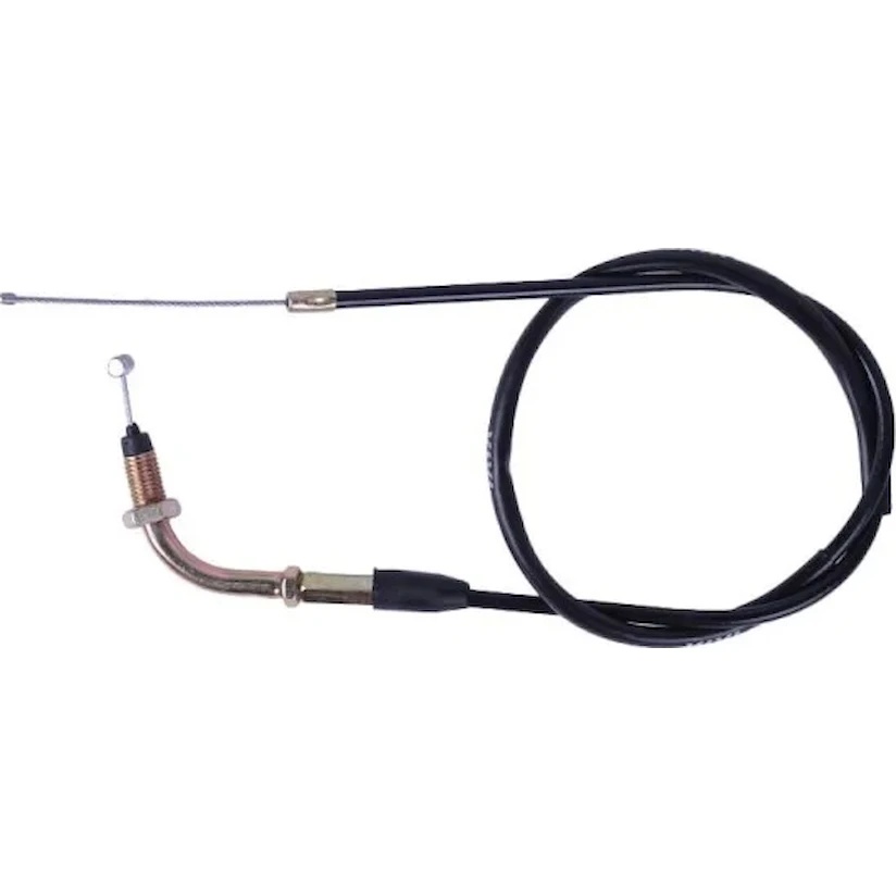 Трос газа TT AGRO MOTO для мопеда Альфа, (верх - резьба, низ - трос), L-830 мм является элементом системы управления двигателем внутреннего сгорания и предназначен для передачи усилия от ручки газа к рычагу управления заслонкой карбюратора. Состоит из внутреннего стального троса, покрытого цинком для защиты от коррозии, и внешней металлопластиковой оплетки. Для обеспечения плавности движения и точности управления мощностью двигателя трос необходимо содержать в чистоте и периодически смазывать внутреннюю сердцевину. Чрезмерные механические нагрузки и коррозия могут привести к обрыву стальной жилы и потере управляемости транспортным средством. В этом случае деталь требуется заменить.