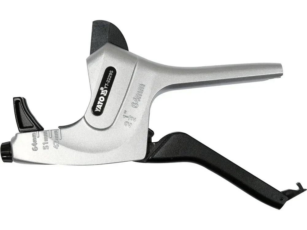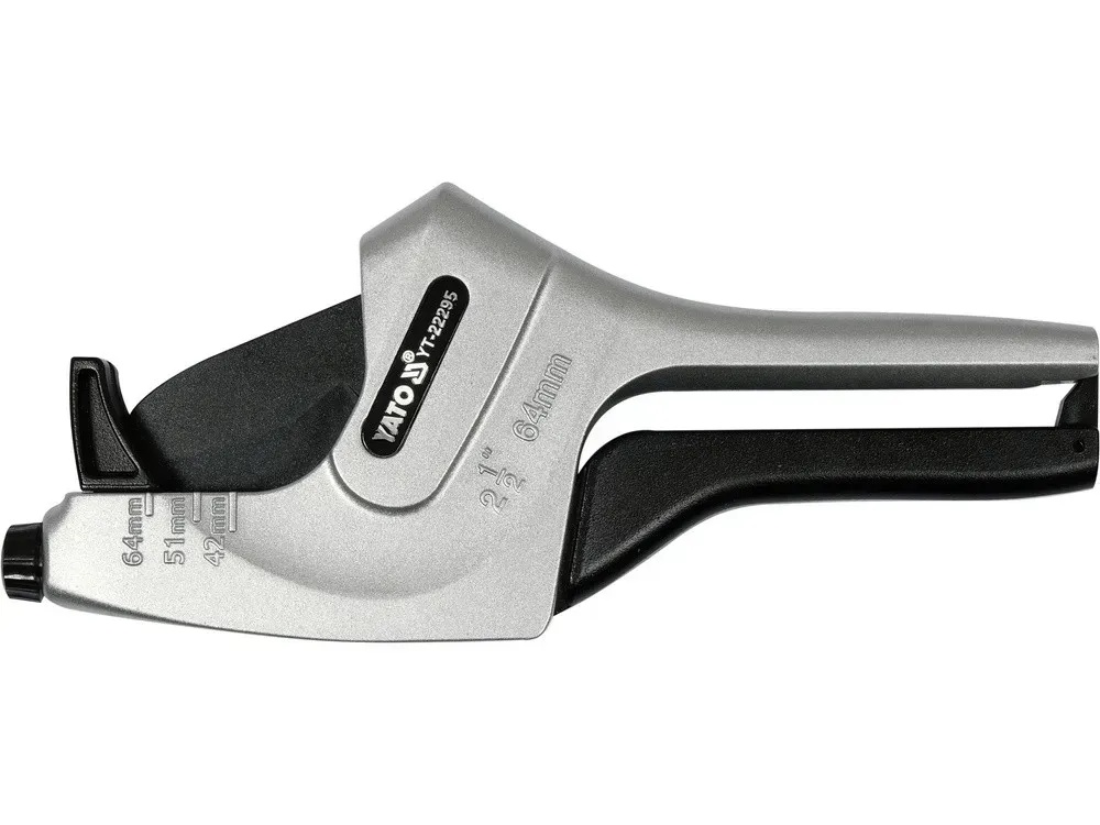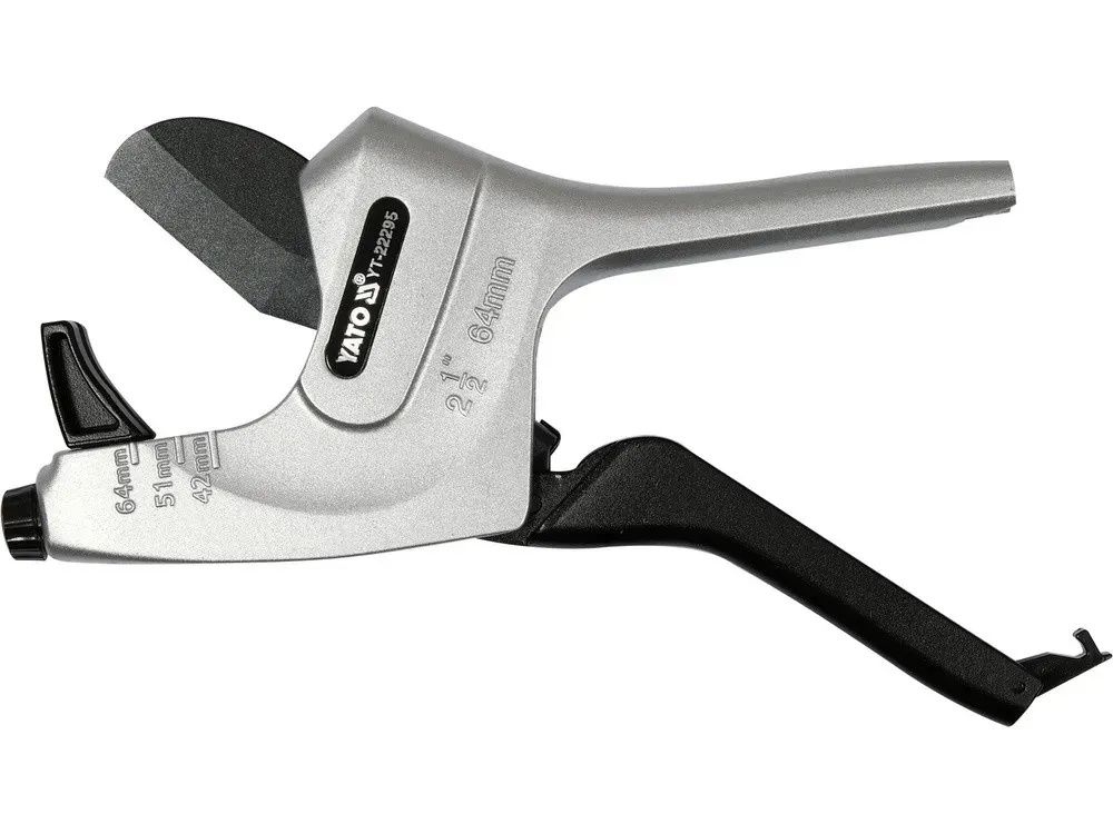 Ножницы YATO YT-22295 для резки труб ПВХ и других пластиков (ПП, ПЭ, ПУ) и трубопроводов. Регулируемый кронштейн на конце лезвия помогает расположить трубы диаметром 40, 50 и 63 мм для повышения производительности резки. Лезвие из высококачественной стали SK5. Лезвие покрыто тефлоновым покрытием, что улучшает плавность реза. Ножницы применяются при сантехнических, монтажных и строительных работах.