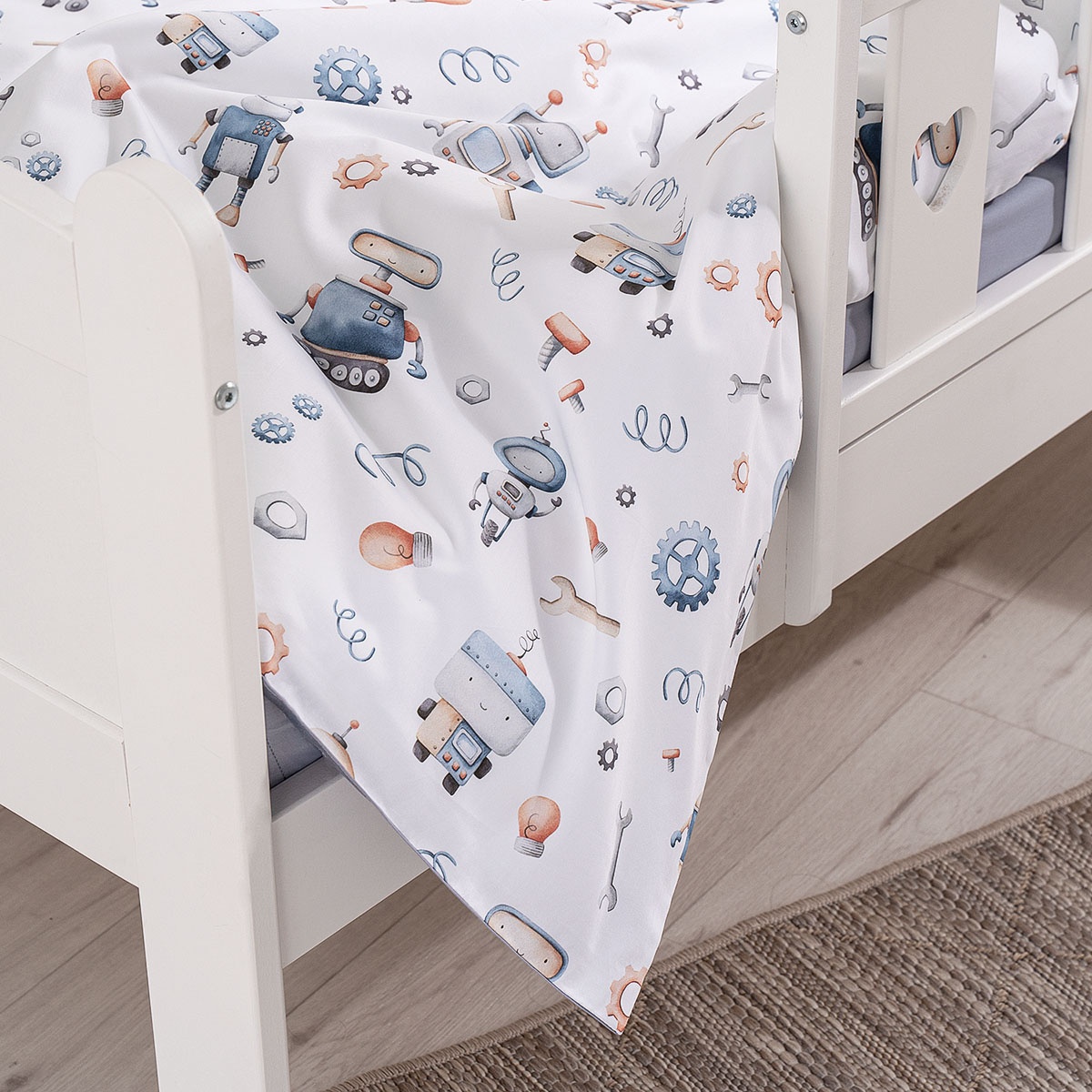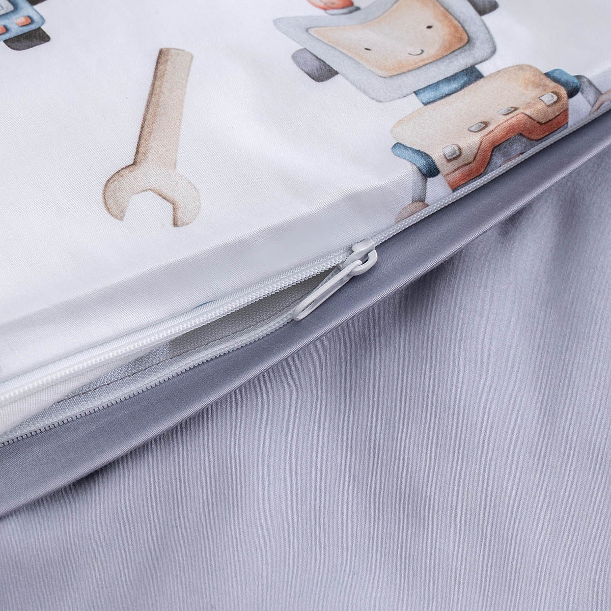 Дизайнерский принт с роботами украсит комнату, при этом не помешает малышу заснуть — цвета в узоре спокойные, натуральных оттенков. А милых акварельных роботов будет интересно рассматривать после пробуждения. Кстати, пододеяльник двусторонний и выгодно сочетается и с наволочкой, и с однотонной простыней.