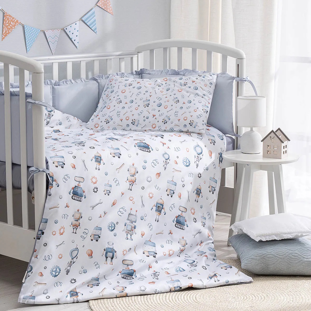 Дизайнерский принт с роботами украсит комнату, при этом не помешает малышу заснуть — цвета в узоре спокойные, натуральных оттенков. А милых акварельных роботов будет интересно рассматривать после пробуждения. Кстати, пододеяльник двусторонний и выгодно сочетается и с наволочкой, и с однотонной простыней.