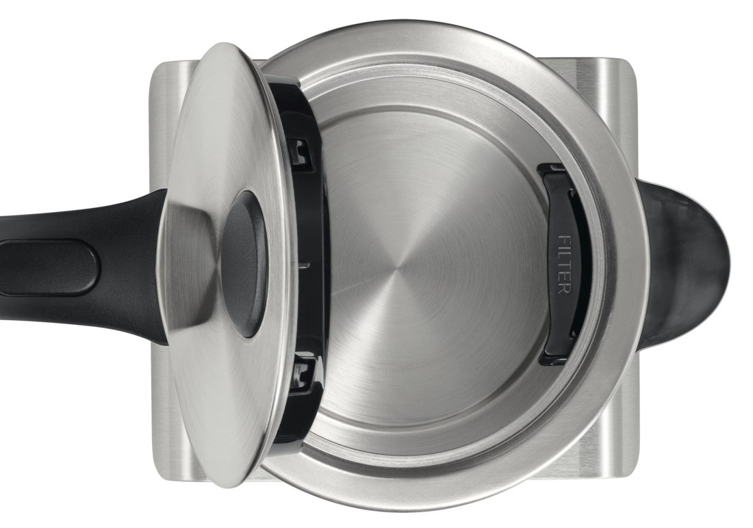 Крышка для наполнения резервуара Bosch TWK 7S05 водой открывается в одно нажатие кнопки на угол порядка 90°, что также сказывается на удобстве чистки «внутренностей» модели от накипи. К слову, предотвратить попадание частичек накипи в чашку с горячим питьём призван специальный фильтр-сеточка.