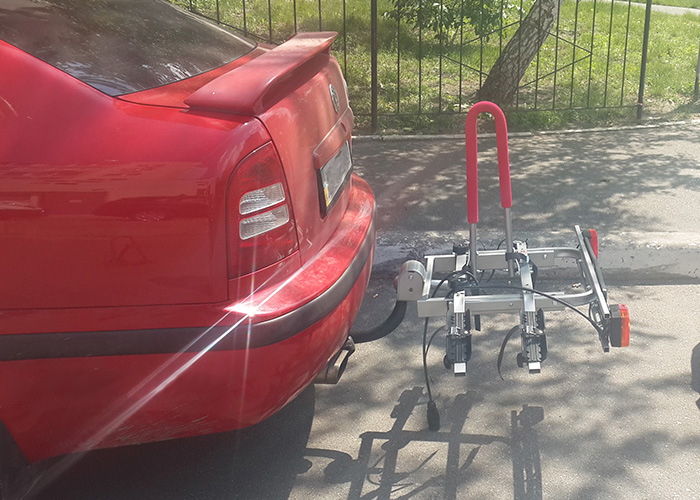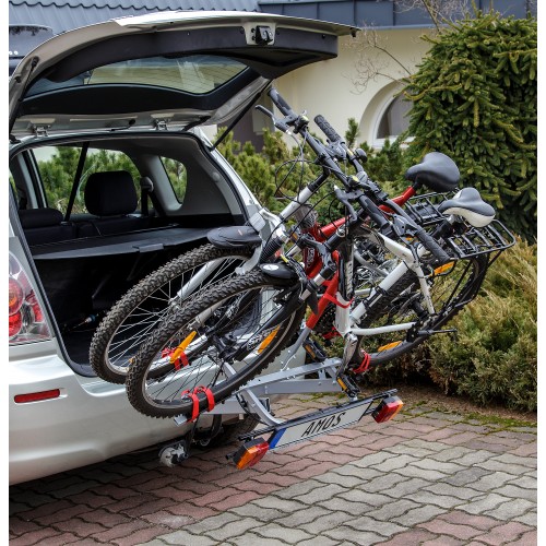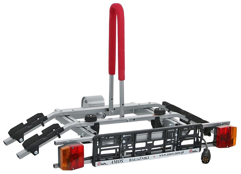Универсальное автомобильное крепление Amos Titan 2 с откидной конструкцией для легкого доступа в багажник устанавливается на фаркоп и позволяет надежно зафиксировать раму одного или двух велосипедов с помощью регулируемых мягких держателей. Откидная велоплатформа оснащена панелью-дублером задних фонарей со стандартным разъемом для подключения к розетке, а также рамкой для автомобильного номера.