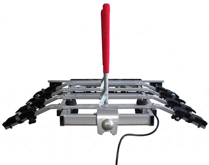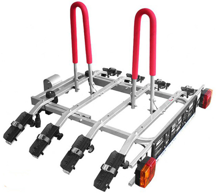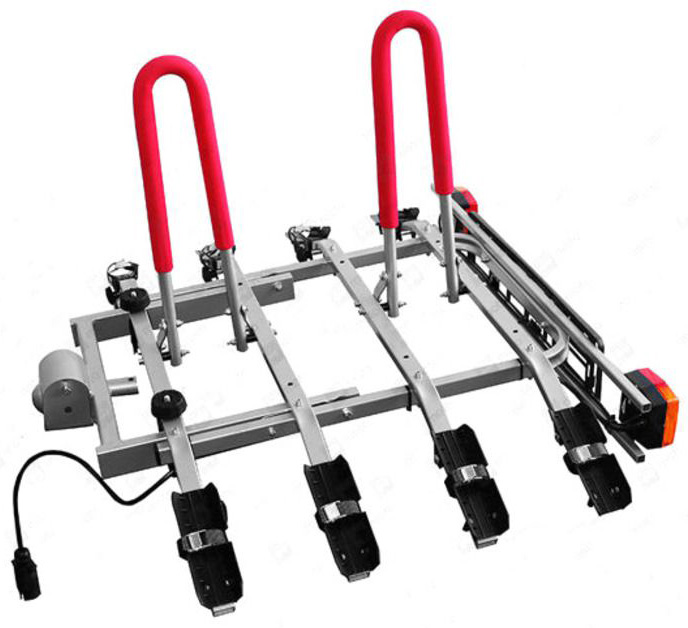 Платформа на фаркоп для перевозки 4-х велосипедов Amos Tytan 4 выполнена из пластика и металла. Оснащено устройство специальными ремнями для крепления велосипедов. Имеет прочное порошковое покрытие. В комплекте есть повторители задних фонарей и остальных необходимых световых с разъемом на 9 контактов, для того, чтобы подключить их к розетке. Устройство оснащено очень качественным и прочным соединением, дополнительной фиксации оно не требует. Держатели для рам имеют мягкое основание и легко выдерживают велосипеды.