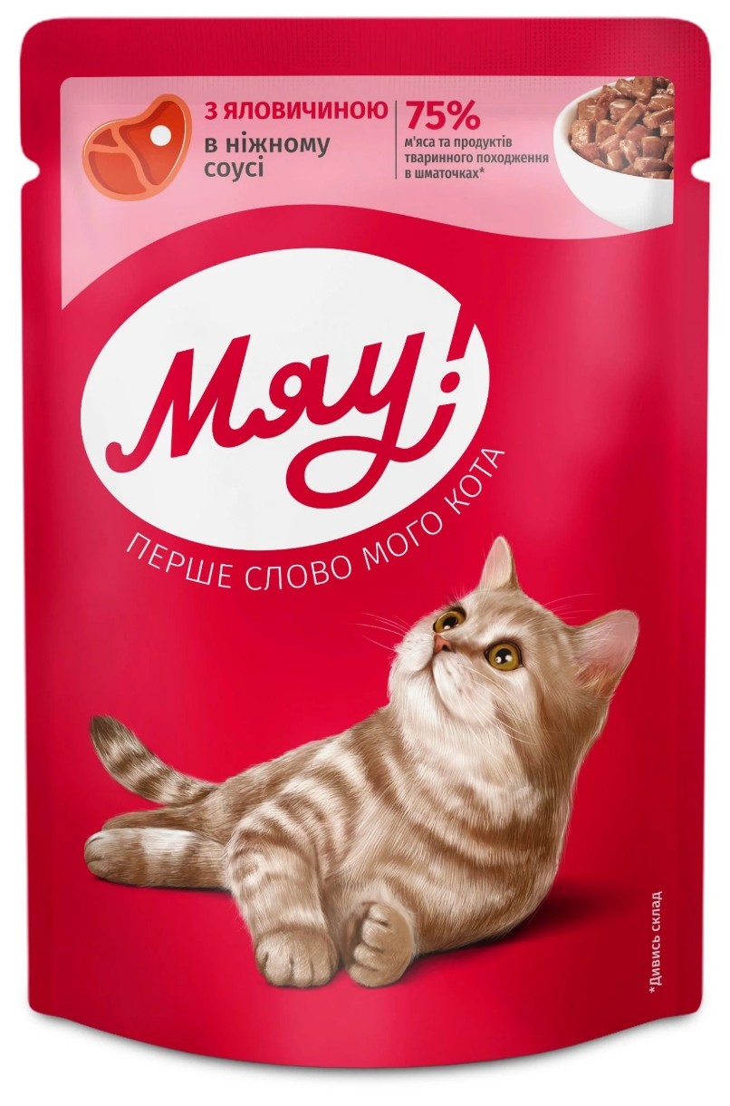Влажный корм для кошек Мяу с говядиной в нежном соусе – полнорационный корм для взрослых кошек.