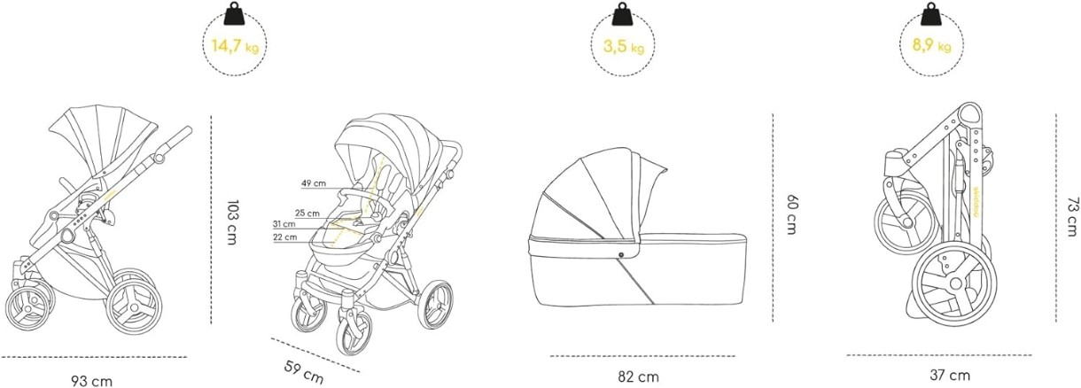 Коляска Oslo — легкая коляска с хорошей амортизацией. Для максимально комфортной езды применили двойную систему амортизации – на раме и независимо на колесах, благодаря чему легко справляется с песком, снегом и бордюрами.