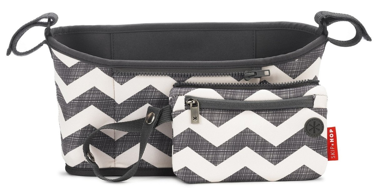 Сумка имеет прямоугольную форму, она изготовлена из серого тканевого материала с белым принтом в виде шеврона. Специальные ремни позволяют крепить ее к большинству колясок. Для этого используются специальные замки-липучки. Также присутствует возможность регулировки. Внутреннее пространство органайзера спланировано таким образом, что по бокам имеются держатели для напитков, регулируемые под требуемый размер. В комплекте с сумочкой идет небольшой кошелек, который крепится к ней с помощью молнии. В него можно положить мобильный телефон, а специальный разъем для наушников позволит слушать музыку во время прогулки. Также кошелек можно использовать отдельно.