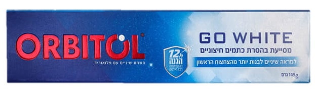 Прекрасным примером является израильская зубная паста Orbitol Go White — вещество обогащено активными отбеливающими компонентами, обладает активными очищающими и антибактериальными свойствами. В составе содержится монофторфосфат — универсальное профилактическое вещество, которое активно борется с развитием кариеса. Паста имеет пролонгированный накопительный эффект, благодаря которому защита от налета длится до 12 часов после непосредственной чистки.