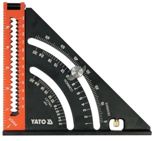 Уголок алюминиевый с ножкой 140 мм. Общая длина кромки 165×185×210 мм. Толщина около 8 мм. Дюймовая шкала до 6 дюймов, без миллиметровой шкалы. Во внутренней части есть насечки с дополнительными шкалами. В пазу находится винт, который устанавливает точные показания шкалы. В основание установлен стальной ввинчивающийся щуп для разметки.