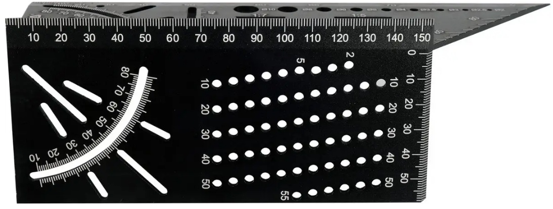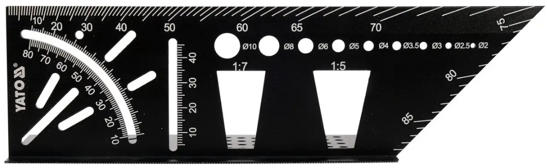 Пространственный угольник YT-70825 предназначен для столярных работ. Изготовлен из алюминия, края имеют миллиметровые деления. Размеры 150×70×215 мм, толщина 2,8 мм. Угольник включает шаблоны, используемые в столярных работах, например, ласточкин хвост, шаблоны отверстий, транспортир и другие. Обработка поверхности — черный анодированный.