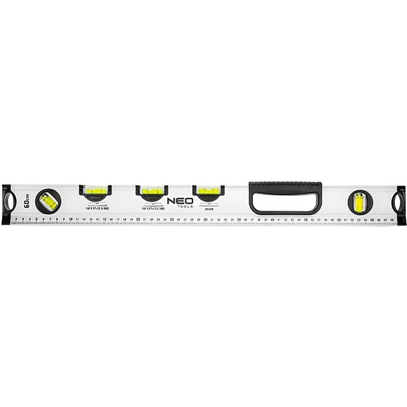 Уровень строительный NEO TOOLS 60 см, 5 глазков, углы 0-1,5-3,5-45-90, 71-122 — это профессиональный измерительный инструмент, созданный для точной работы при строительстве и отделке. Благодаря сочетанию прочности и удобства, он идеально подходит как для специалистов, так и для домашних мастеров.