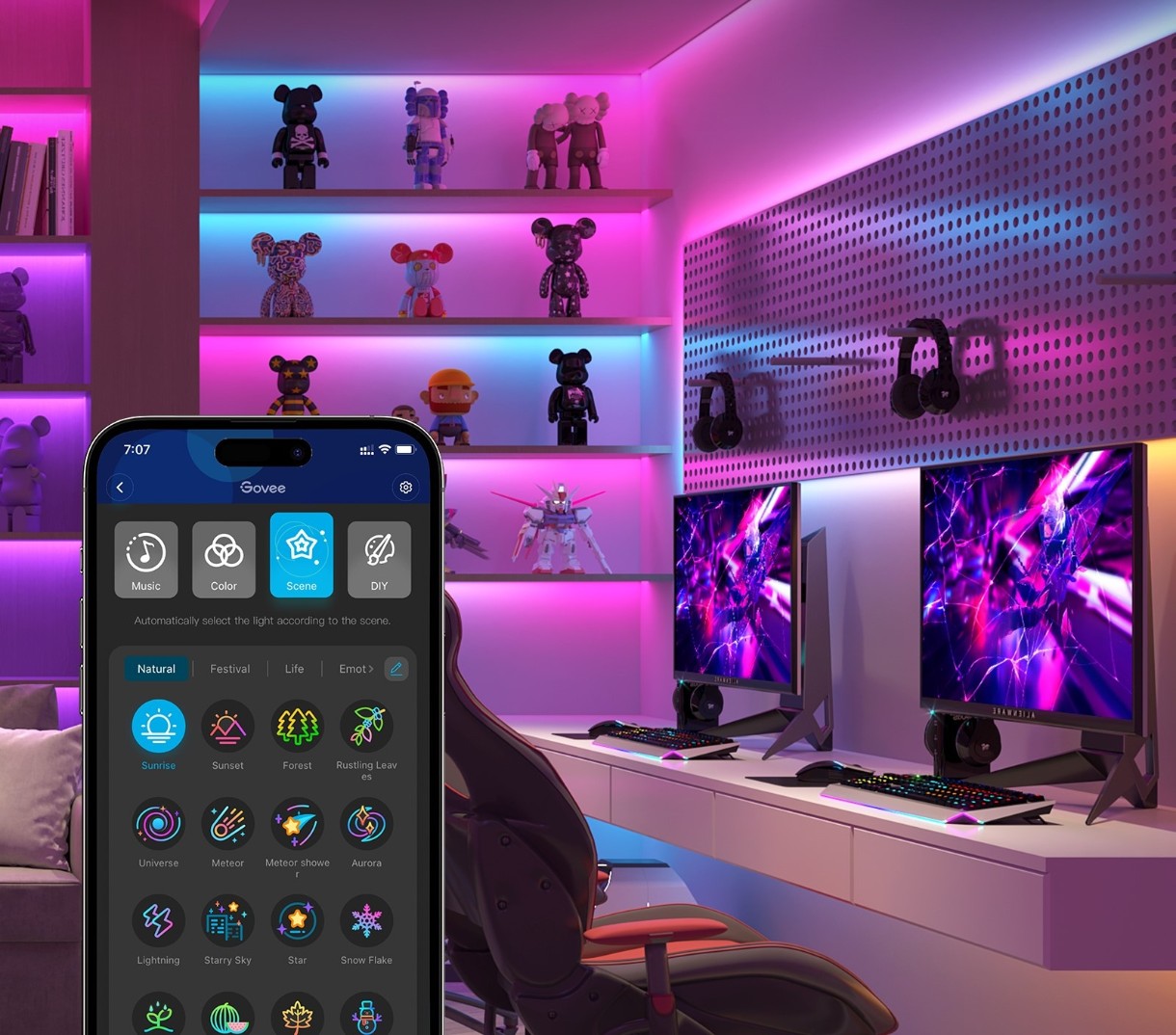 Умная светодиодная лента RGBIC+ Wi-Fi длиной 3, 5 или 10 метров идеально подходит для освещения всего дома во время вечеринок, свадеб, игр или стриминга. Управляйте освещением без помощи рук с помощью Amazon Alexa или Google Assistant и используйте музыкальный режим, чтобы огни танцевали в ритме вашей любимой музыки. С помощью удобной функции «Сделай сам» вы можете создавать собственные световые эффекты и делиться ими с другими. Благодаря гибкому дизайну и простоте установки умная светодиодная лента Govee предлагает потрясающую цветовую палитру, которая поднимет эстетику вашего интерьера на новый уровень.
