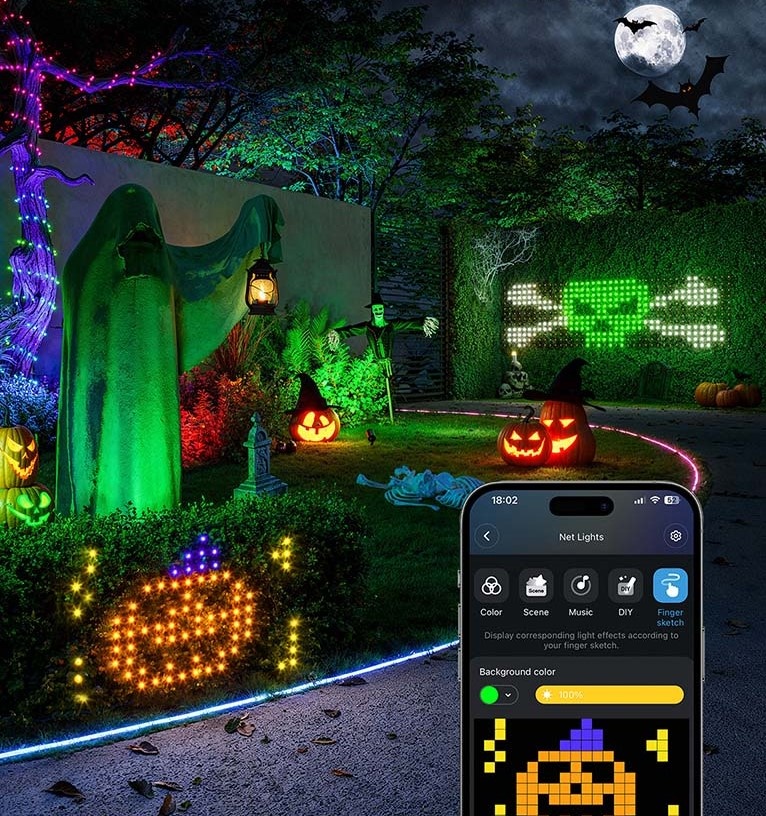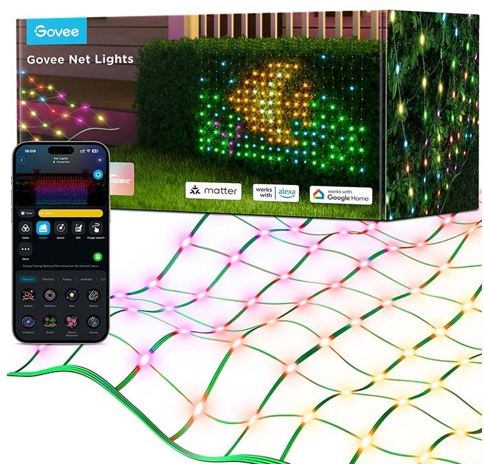 Творческий режим DIY: Загружайте изображения и гифки для создания забавных и анимированных световых эффектов. Ламповые бусины в светодиодных сетчатых светильниках обеспечивают высокую плотность пикселей и превосходное качество отображения. Световой эффект RGBIC: Управляйте каждым шариком светодиодной лампы индивидуально для получения красочных световых эффектов. Украсьте свое открытое пространство яркими цветами и ярким освещением. Защита от атмосферных воздействий для использования на открытом воздухе: Благодаря водонепроницаемости IP65 и устойчивым к растяжению проводам этот светильник идеально подходит для надежного использования на открытом воздухе. (Примечание: адаптер питания не является водонепроницаемым.) Простота установки: Поместите светодиодную сетку в нужное место и закрепите прилагаемыми кабельными стяжками. 4-метровый кабель идеально подходит для освещения кустов, садов, газонов, террас и многого другого. Голосовое управление и управление через приложение: совместимо с Alexa и Google Assistant. Используйте приложение Govee Home для интеллектуальных функций, таких как цвета и эффекты DIY, таймеры и различные режимы, чтобы настроить освещение.