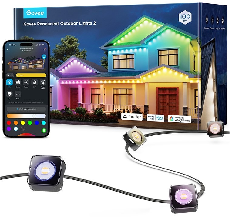 Усовершенствованное RGBICW-освещение: постоянные наружные светильники Govee 2 имеют улучшенную конструкцию, обеспечивающую плавный световой эффект с точным отображением 16 миллионов цветов. Белое освещение мощностью 40 лм также повышает безопасность вашего дома. Свет ровный и яркий, без фиолетового оттенка.