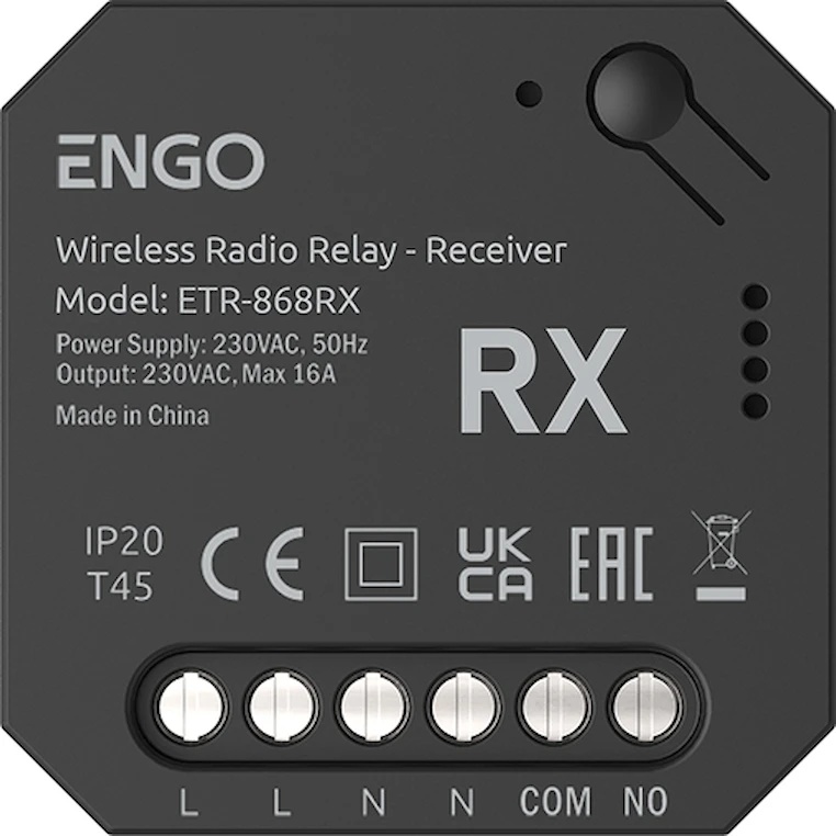 Умное реле Engo ETR-868RX предназначено для дистанционного управления электрическими приборами через радиоканал 868 МГц. Оно совместимо с центральным модулем ETR-868, поддерживает управление через мобильное приложение Engo Smart Home и обеспечивает удобство интеграции в систему умного дома. Реле компактное, легко монтируется, работает в широком диапазоне температур и позволяет автоматизировать освещение, бытовую технику и другие электрические нагрузки.