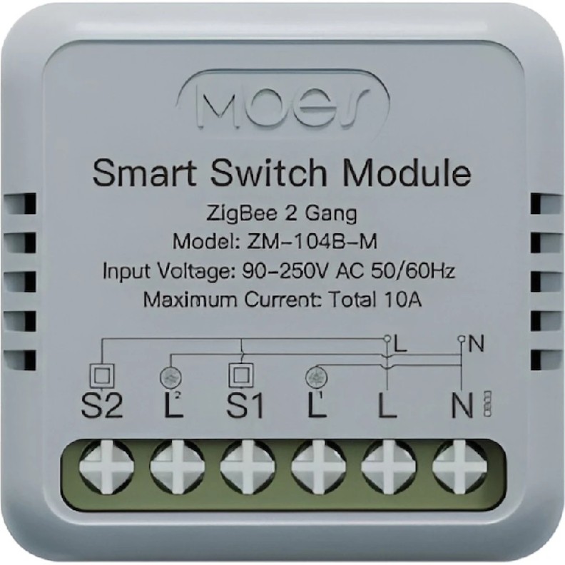 Умное реле Moes ZM‑104B‑M‑LT‑MS — это компактный двухканальный Zigbee‑модуль управления для интеграции традиционных электрических цепей в систему умного дома. Он устанавливается в монтажную коробку или за выключателем и позволяет удалённо включать и выключать два независимых канала (с нагрузкой до 10 A на канал) через совместимый Zigbee‑шлюз и приложение Tuya Smart / Smart Life / Moes Smart на смартфоне.