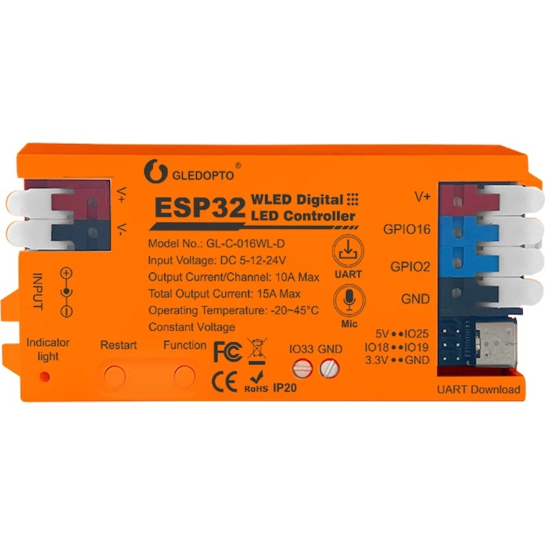 Умный контроллер Gledopto GL‑C‑016WL‑D — это мощный Wi‑Fi‑LED‑контроллер на базе чипа ESP32 с поддержкой прошивки WLED, предназначенный для управления цифровыми/адресуемыми светодиодными лентами (RGB IC) с напряжением 5–24 V DC. Он обеспечивает максимальный суммарный ток до 15 A, что позволяет управлять светодиодами общей мощностью до ≈360 Вт.