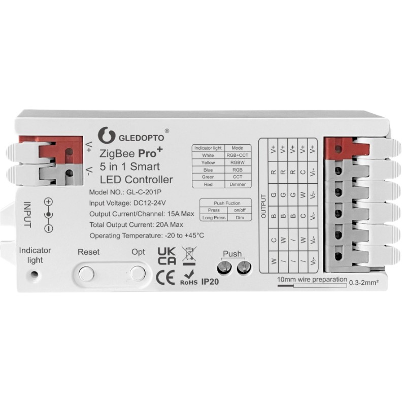 Умный контроллер Gledopto GL‑C‑201P — это профессиональный Zigbee 3.0 LED‑контроллер с поддержкой 5‑в‑1 режимов управления светодиодной лентой: RGBCCT, RGBW, RGB, CCT и Dimmer. Он предназначен для управления 12–24 В DC LED‑лента различных типов с регулировкой цвета, цветовой температуры и яркости прямо из приложения «умного дома» через совместимый Zigbee‑шлюз (например, Tuya/SmartLife, Philips Hue, SmartThings и др.) или с помощью RF‑пульта 2.4 GHz и настенного переключателя.