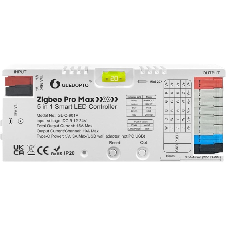 Gledopto GL‑C‑601P — это мощный и универсальный умный LED‑контроллер Zigbee Pro Max 5‑в‑1, разработанный для управления аналоговыми LED‑ленторами с регулируемой яркостью, цветом и цветовой температурой. Он поддерживает пять рабочих режимов: RGBCCT, RGBW, RGB, CCT и Dimmer, что обеспечивает гибкость настройки освещения под разные задачи и сценарии.