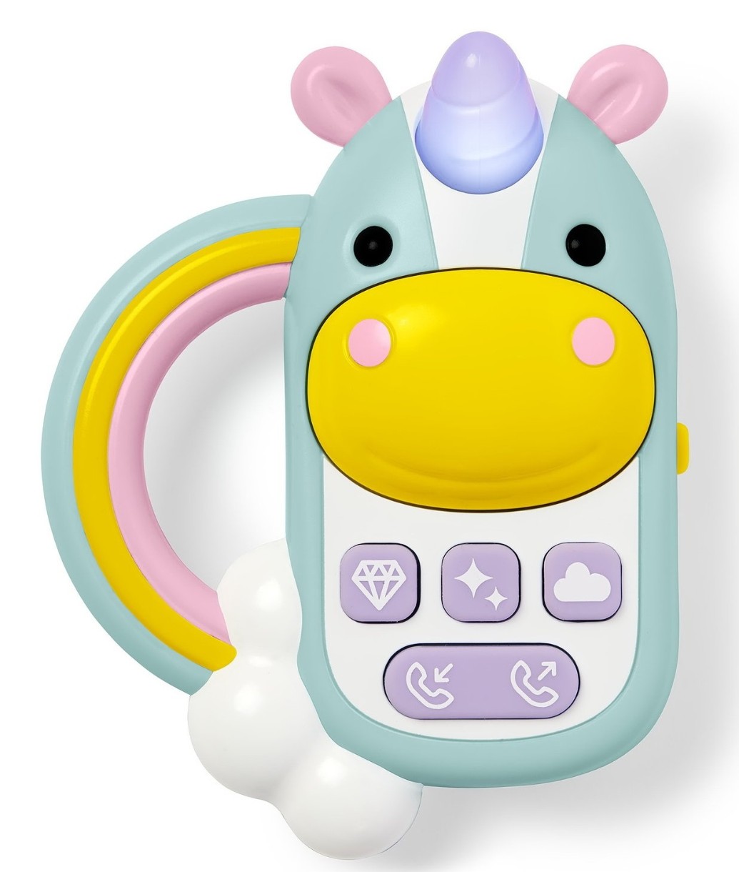 Игрушка напоминает миниатюрный телефончик с разными кнопками и забавной мордашкой единорога. При нажатии на носик звучит приятная ненавязчивая мелодия и светится рог. Кнопочки, при нажатии, воспроизводят различны емелодичные звуки. Всего в телефоне шесть звуков и мелодий.