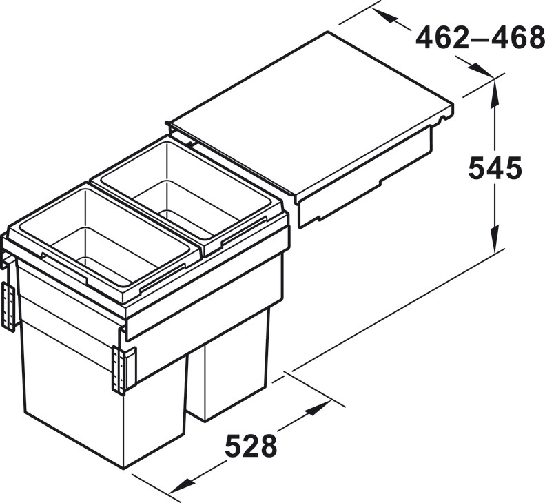 Телескопические направляющие обеспечивают полное выдвижение корзин без усилий и исключают их опрокидывание. Крышка встроена в механизм и автоматически поднимается при выдвижении, обеспечивая быстрый доступ к содержимому. Конструкция отличается прочностью и долговечностью, что делает её удобной для ежедневного использования.