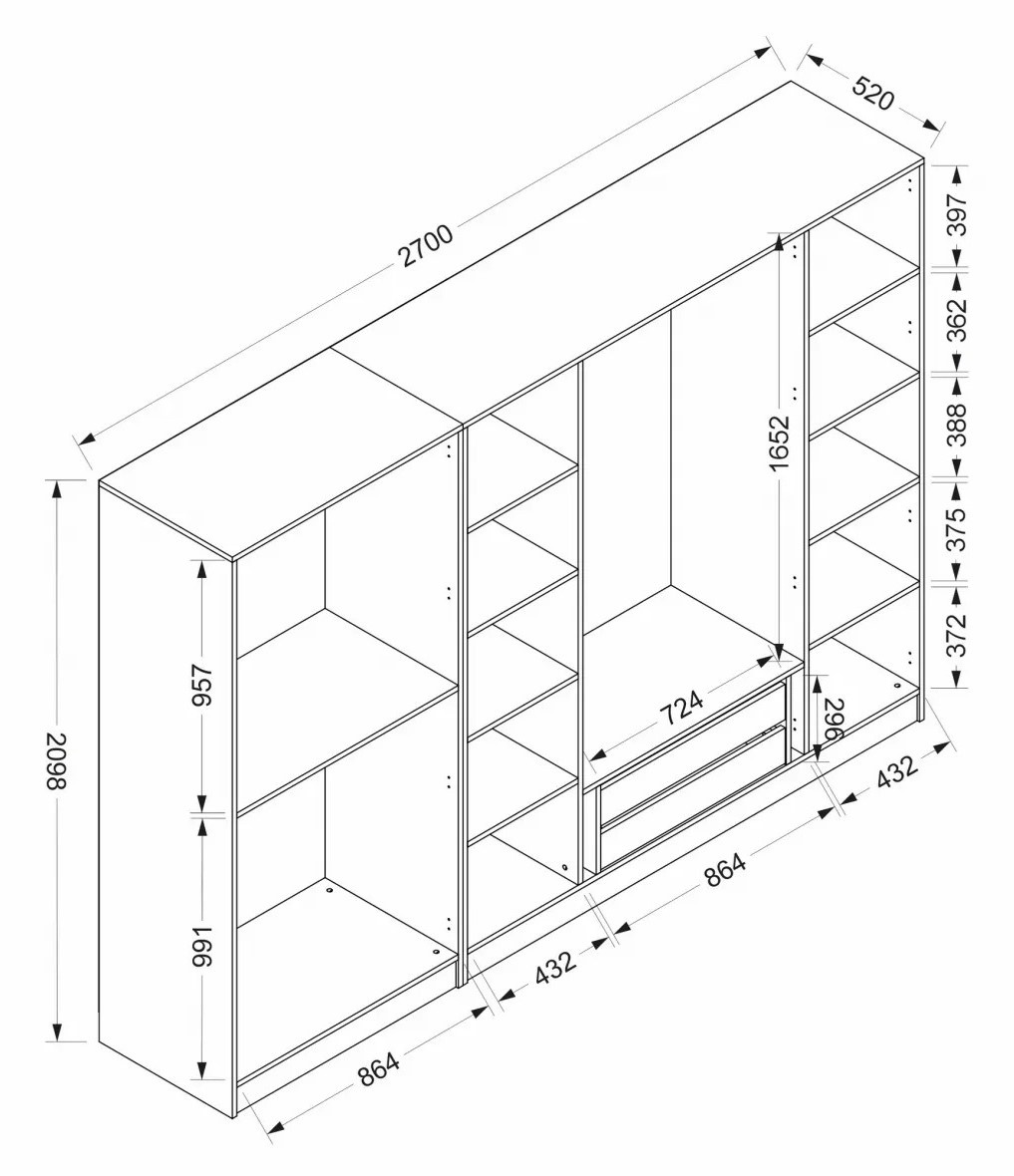 Большие размеры создают удобное пространство для хранения. Ширина 270 см, высота 210 см и глубина 52 cm позволяют разместить одежду, аксессуары и другие предметы без лишних усилий. Гардероб помогает поддерживать порядок и избавляет от ощущения тесноты.
