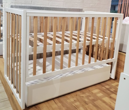 Кроватка имеет маятниковый механизм поперечного качания с фиксатором, а также возможность опускания бортика. Высоту спального места можно регулировать на двух уровнях. Все детали имеют безопасные округлые формы, а также бортики с накладками-грызунками. Комплектуется кровать закрытым, двухкамерным ящиком для хранения детских вещей (ящик изготовлен из высококачественного сертифицированного ДСП).