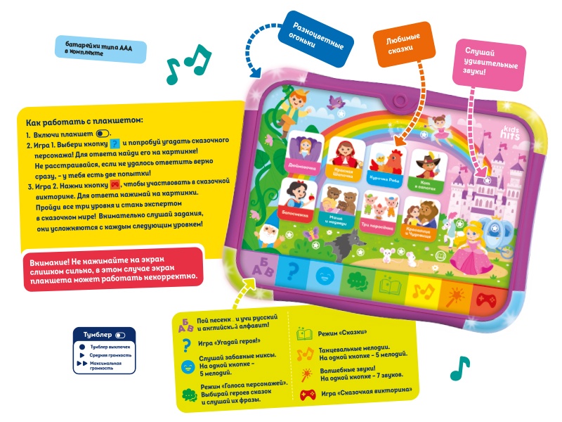 В результате, Kids Hits Тач Пэд "В мире сказок" - это не просто игрушка, а настоящий проводник в мир знаний и развлечений, который развивает познавательные способности и способствует сенсорному восприятию вашего ребенка.