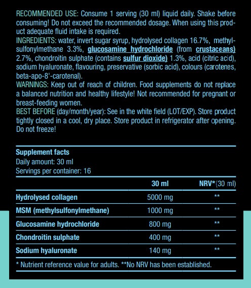 Облегчение боли, восстановление, защита. Продукт обеспечивает уход за суставами по трем направлениям. Во-первых, высокое содержание метилсульфонилметана облегчает болевые ощущения, вызванные повреждением и воспалением суставов. Во-вторых, высокое содержание глюкозамина и хондроитина способствует восстановлению хрящей и синовиальной жидкости для улучшения амортизации и подвижности суставов — и вы снова готовы к новым достижениям. Наконец, происходит укрепление суставов благодаря высокому содержанию коллагена; это отличная профилактика заболеваний суставов.