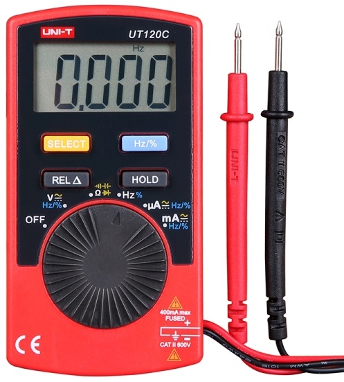 Цифровой мультиметр UNI-T (UT120C) — многофункциональный карманный цифровой мультиметр. Это удобное портативное устройство питается от 3-вольтной батареи. В мультиметре UNI-T (UT120C) предусмотрены измерения различных параметров (AC/DC напряжение, AC/DC ток, сопротивление, емкость, частота) и тесты (тестирование диодов, прозвонка цепи), функции автоматического отключения, удержания данных.