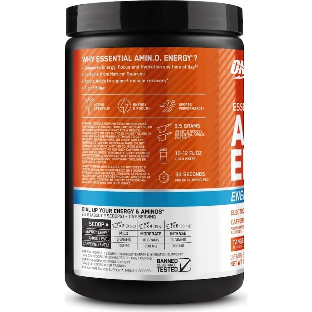 Смешайте две мерные ложки Essential Amin.O. Energy с 300–350 мл холодной воды и принимайте до, во время или после тренировки.