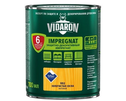 Пропитка Vidaron Impregnat глубоко проникает в поры древесины, защищая ее от домового грибка, синевы и от насекомых, продлевая срок ее службы. Пропитка, вникая в древесину, не образует лакированной поверхности, которая со временем отслаивается, благодаря чему в будущем легко провести реновацию,обеспечивает высокую прочность и предохраняет от вымывания защитных веществ, эффективно защищая деревянные предметы от разрушительного действия атмосферных факторов на длительное время, легко наносится.