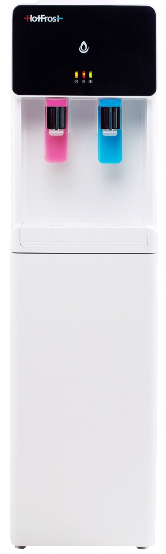 Черная глянцевая лицевая панель выгодно контрастирует с основным снежно-белым цветом диспенсера. На этой панели находятся индикаторы-светодиоды, которые будут всегда держать вас в курсе происходящего с аппаратом: нагревает ли он воду, происходит ли охлаждение. Яркие огоньки светодиодов видны как в полной темноте, так и при ярком солнечном свете.
