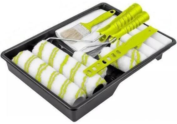 Комплектация2 полиэстеровых валика 230мм с ворсом 12мм, 3 полиэстеровых валика 100мм, 3 валика из полиэстеровой пены 100мм, держатели для валиков 230мм и 100мм, пластиковая защитная плёнка, поддон для краски 9", кисть 50мм, пластиковая лопатка для смешивания краски