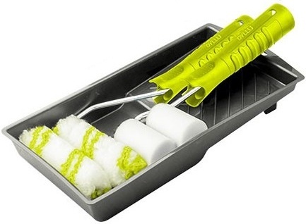 Комплектация2 валика полиэстер 100 мм с ворсом 12 мм, 2 валика из полиэстеровой пены 50 мм, 1 держатель цилиндрического валика 100 мм, 1 держатель цилиндрического валика 50 мм, 1 поддон для краски 4"