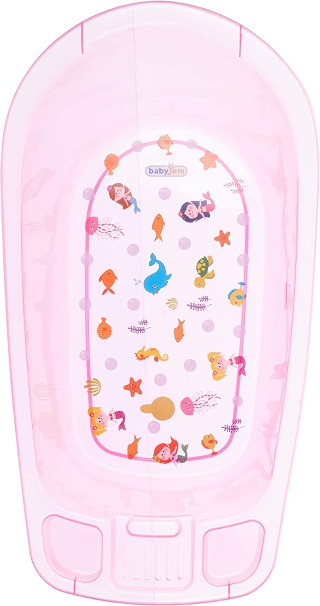 Ванна имеет прозрачную версию с забавными подводными изображениями на дне. В ванну встроен держатель для мыла, а ванна оснащена пробкой для ванны. Ванна имеет длину 80 см, ширину 25 см и глубину 21 см. Ванна вмещает около 50 литров, но обратите внимание: рекомендуемый объем воды — 14 литров. Всегда держите ребенка во время купания или используйте вкладыш для ванны (приобретается отдельно). Используйте ванну на твердой поверхности или подходящую подставку для ванны Babyjem.