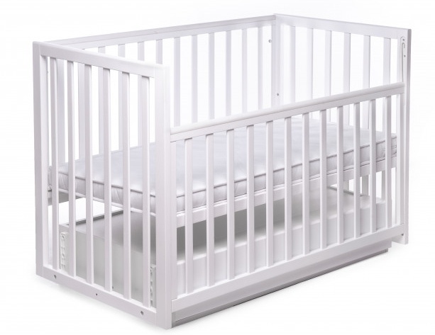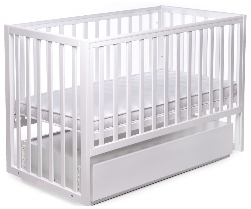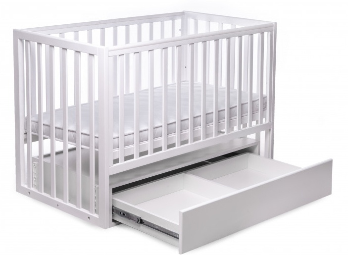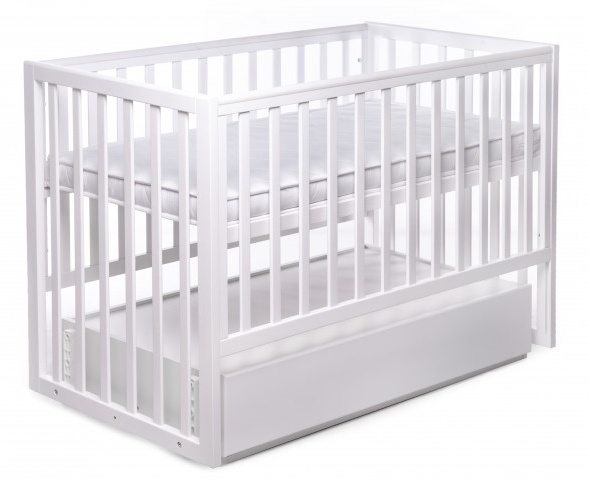 Кроватка имеет маятниковый механизм поперечного качания с фиксатором, а также возможность опускания бортика. Высоту спального места можно регулировать на двух уровнях. Все детали имеют безопасные округлые формы, а также бортики с накладками-грызунками. Комплектуется кровать закрытым, двухкамерным ящиком для хранения детских вещей (ящик изготовлен из высококачественного сертифицированного ДСП).