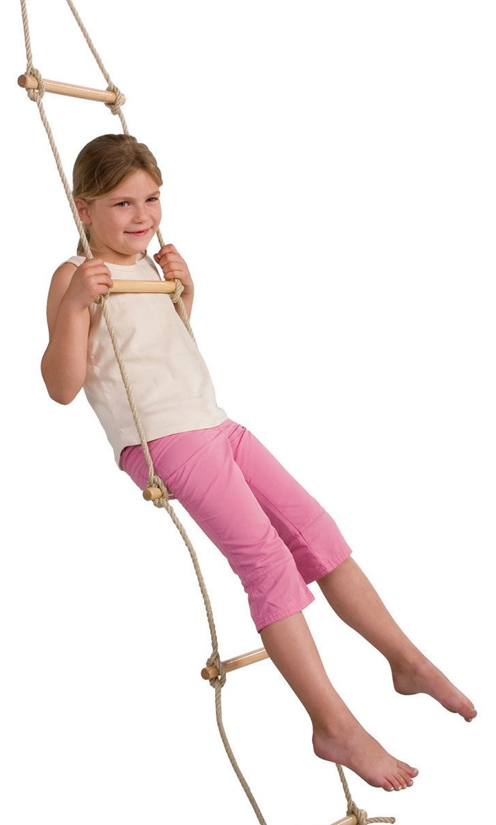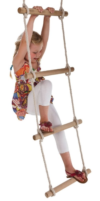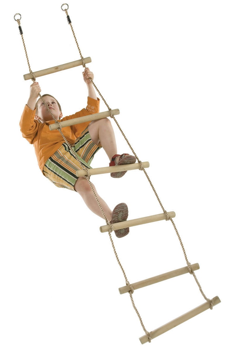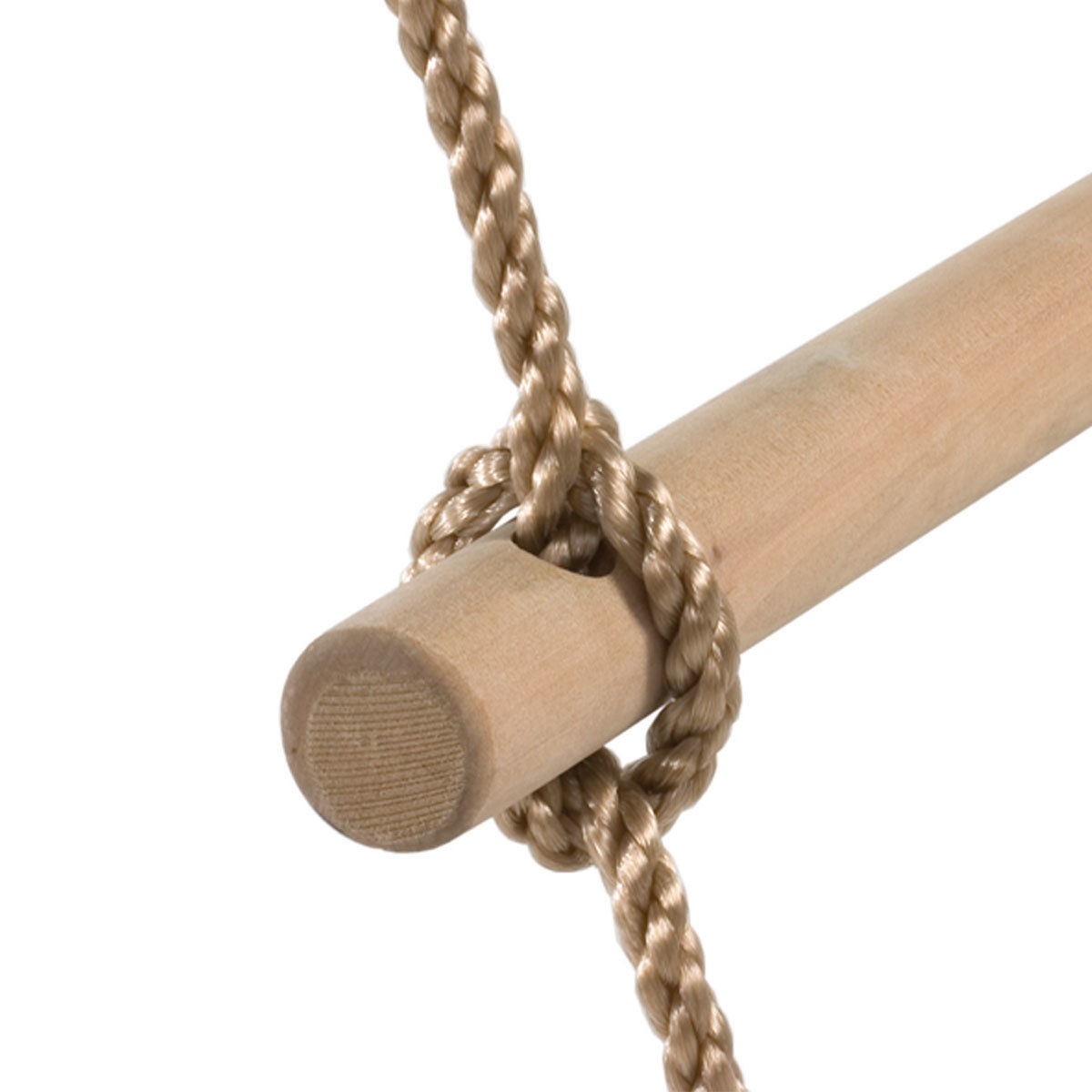 Материал: ступеньки из древесины твердых пород Ø 35 x 400мм, пропитаны антисептиком на основе меди. Веревки прочные РР-10мм. Узлы типа ‘сквозь и вокруг’ не позволяют ступенькам проворачиваться. Кольца и восьмерки сделаны из гальванизированной стали. Страховочные верхние узлы на веревке изготовлены из черного пластика.
