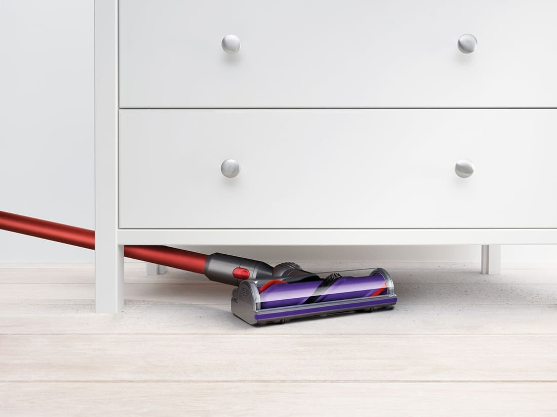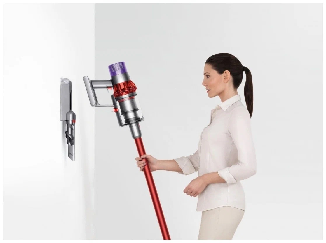 Двигатель пылесоса Dyson Cyclone V10™ размещен над рукояткой, поэтому центр тяжести находится близко к руке, что облегчает уборку высоко расположенных поверхностей и труднодоступных мест.