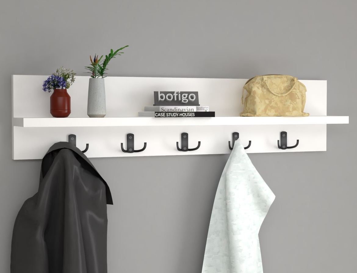 Настенная вешалка Bofigo 21-12-01 — компактное и практичное решение для хранения одежды и аксессуаров в прихожей или других помещениях. Модель изготовлена из прочной ДСП и предназначена для крепления к стене, что помогает рационально использовать пространство и поддерживать порядок. Ширина изделия составляет около 80 см, что делает её удобной для размещения курток, пальто, сумок и других предметов. Лёгкий и лаконичный дизайн позволяет вешалке гармонично вписаться в интерьер любого стиля, создавая аккуратный и функциональный уголок для верхней одежды.