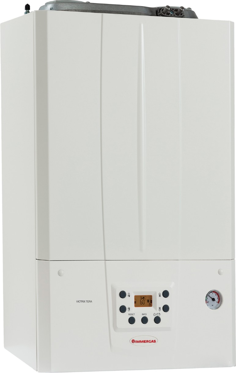 IMMERGAS VICTRIX TERA 32 1 — настенный конденсационный двухконтурный газовый котел с закрытой камерой сгорания. Производство горячей воды моноспиральным, нержавеющим теплообменником 16,5 л/мин. Отвод продуктов сгорания через коаксиальный дымоход 60/100 или раздельные трубы 80/80. Полезная тепловая мощность на отопление 28 кВт, на ГВС 32 кВт. Очень высокая экономичность благодаря: