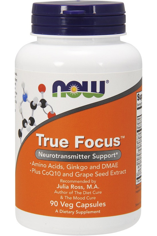 Биологически активная добавка True Focus от американского производителя NOW Foods предназначена для улучшения работы головного мозга, концентрации внимания. Идеальна для людей, деятельность которых связана с умственной деятельностью. Комплекс витаминов поможет улучшить обмен веществ, активирует важные соединения, отвечающих за нормальное функционирование нервной системы. Витаминный комплекс «Тру Фокус» 100 vcap содержит следующие компоненты: аскорбат калия; таурин; кофермент Q10; экстракт листьев гинкго; диметиламиноэтанол; экстракт косточек винограда; фенилаланин; L-Тирозин; витамины С и В6.