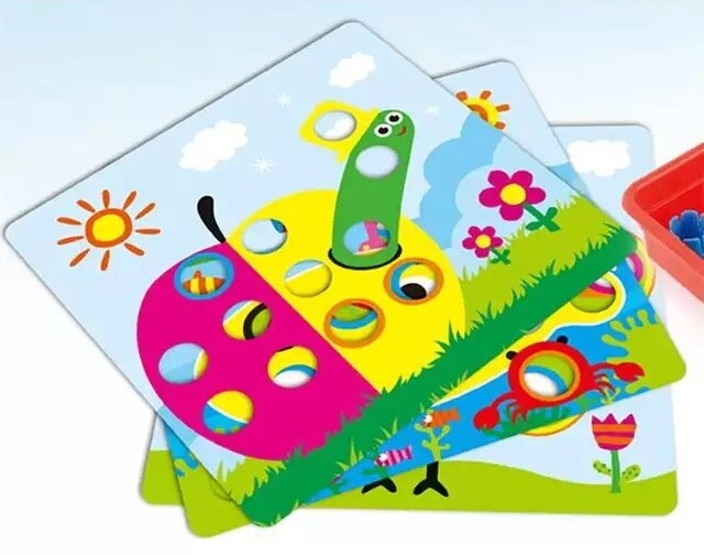 Игра стимулирует развитие координации глаз и рук, а дети весело придумывают собственные мозаичные узоры.